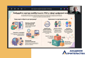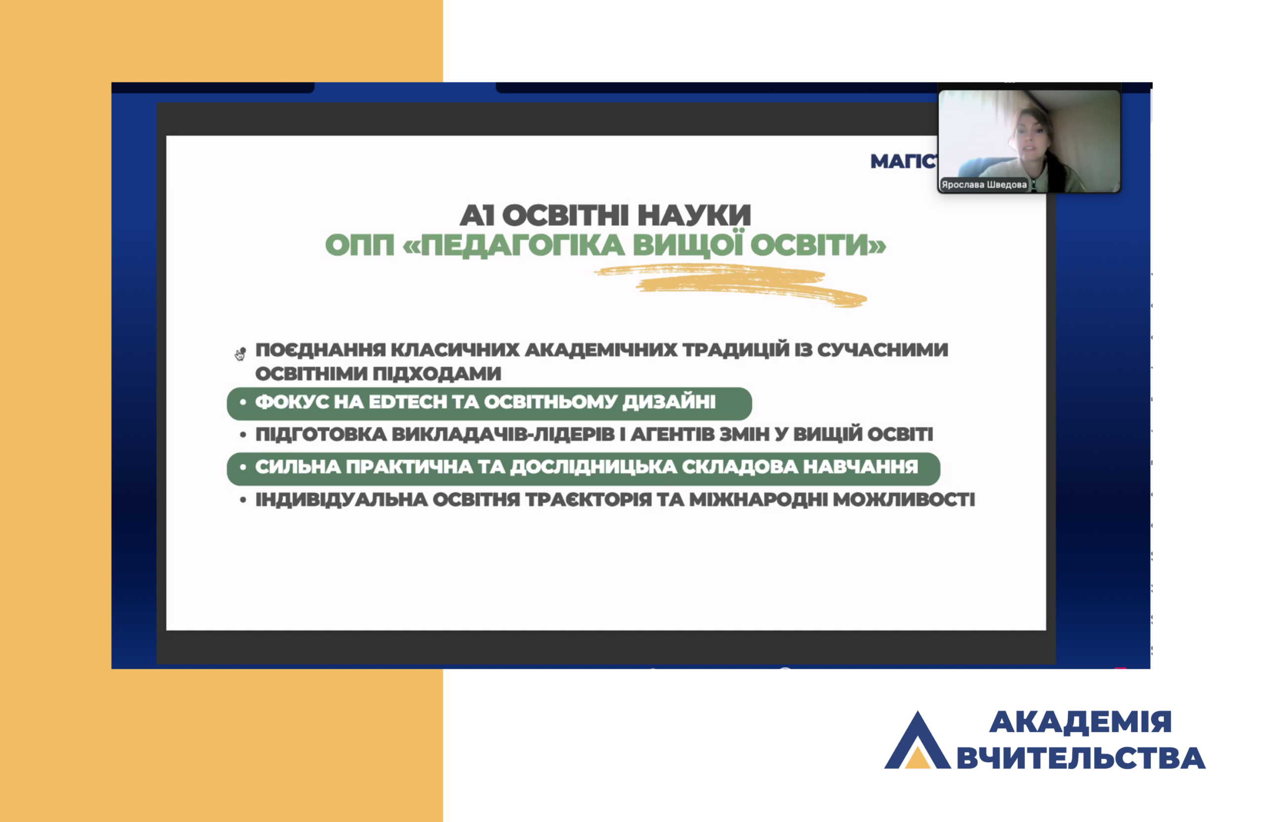 Модератором заходу виступила Тетяна Даценко, заступник директора Академії вчительства, кандидат психологічних наук. Освітні програми магістратури та аспірантури кафедри інноваційної педагогіки, освітніх трансформацій і лідерства представили гаранти: