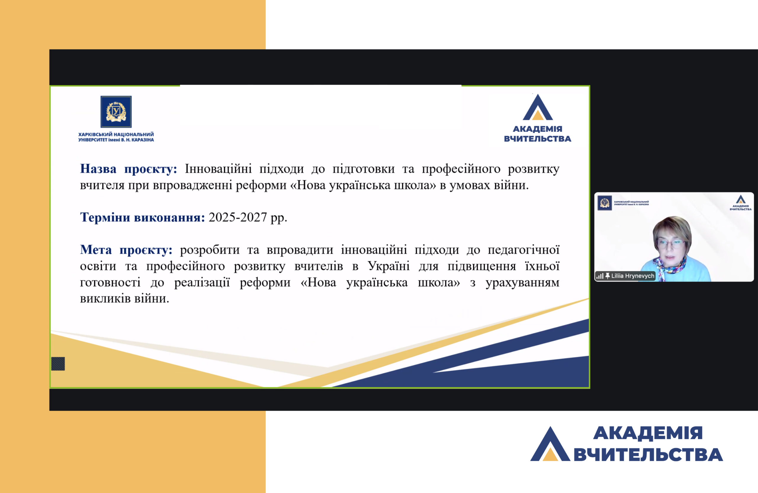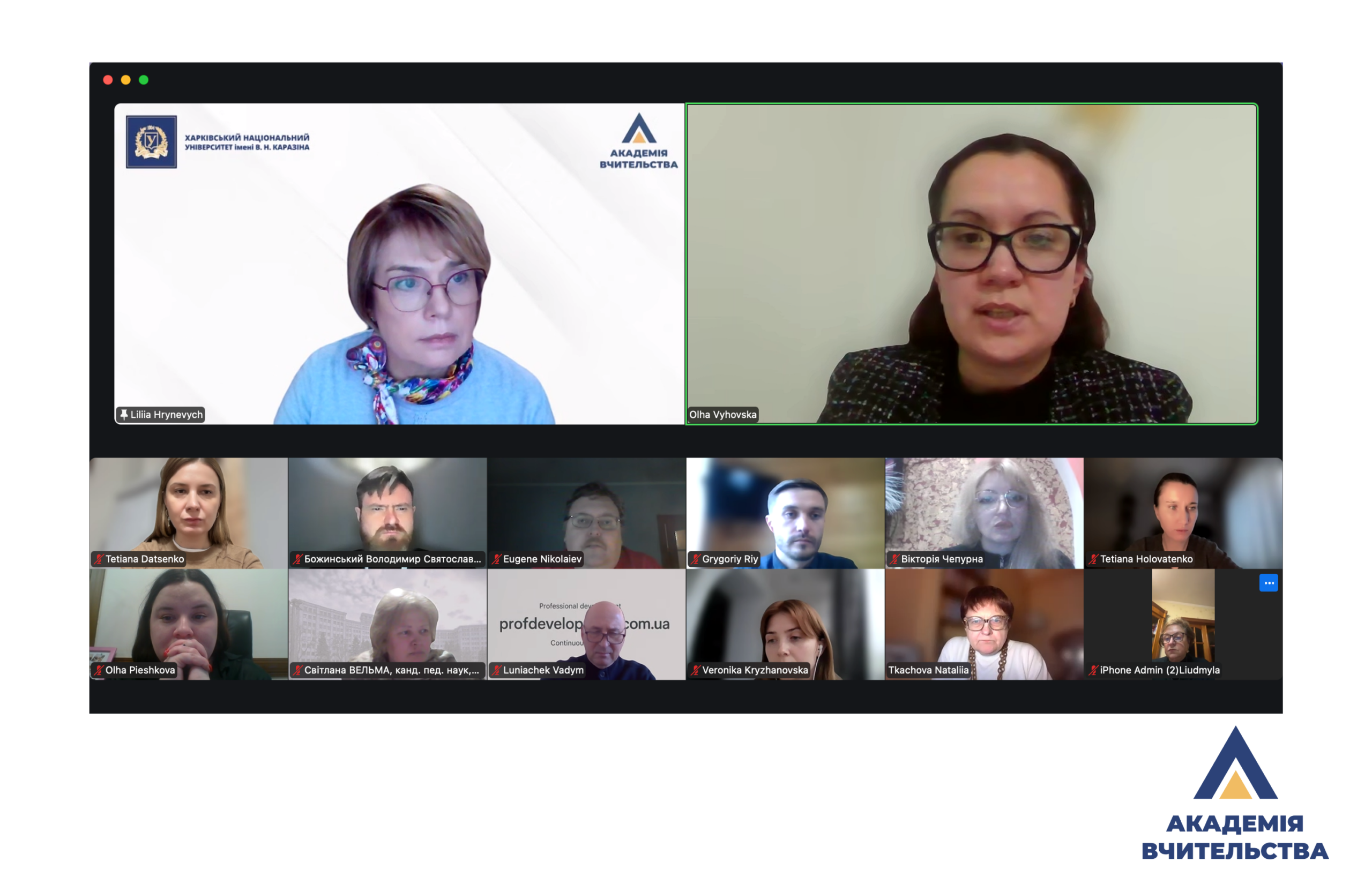 11 грудня 2025 року відбувся науковий семінар «Професійна підтримка і професійний розвиток вчительства: напрями вдосконалення інструментів та політик». У роботі семінару взяли участь виконавці наукових тем ННІ «Академія вчительства» Харківського національного університету імені В. Н. Каразіна, науково-педагогічні працівники кафедри інноваційної педагогіки, освітніх трансформацій і лідерства. Захід модерувала директор Академії Ольга Виговська.