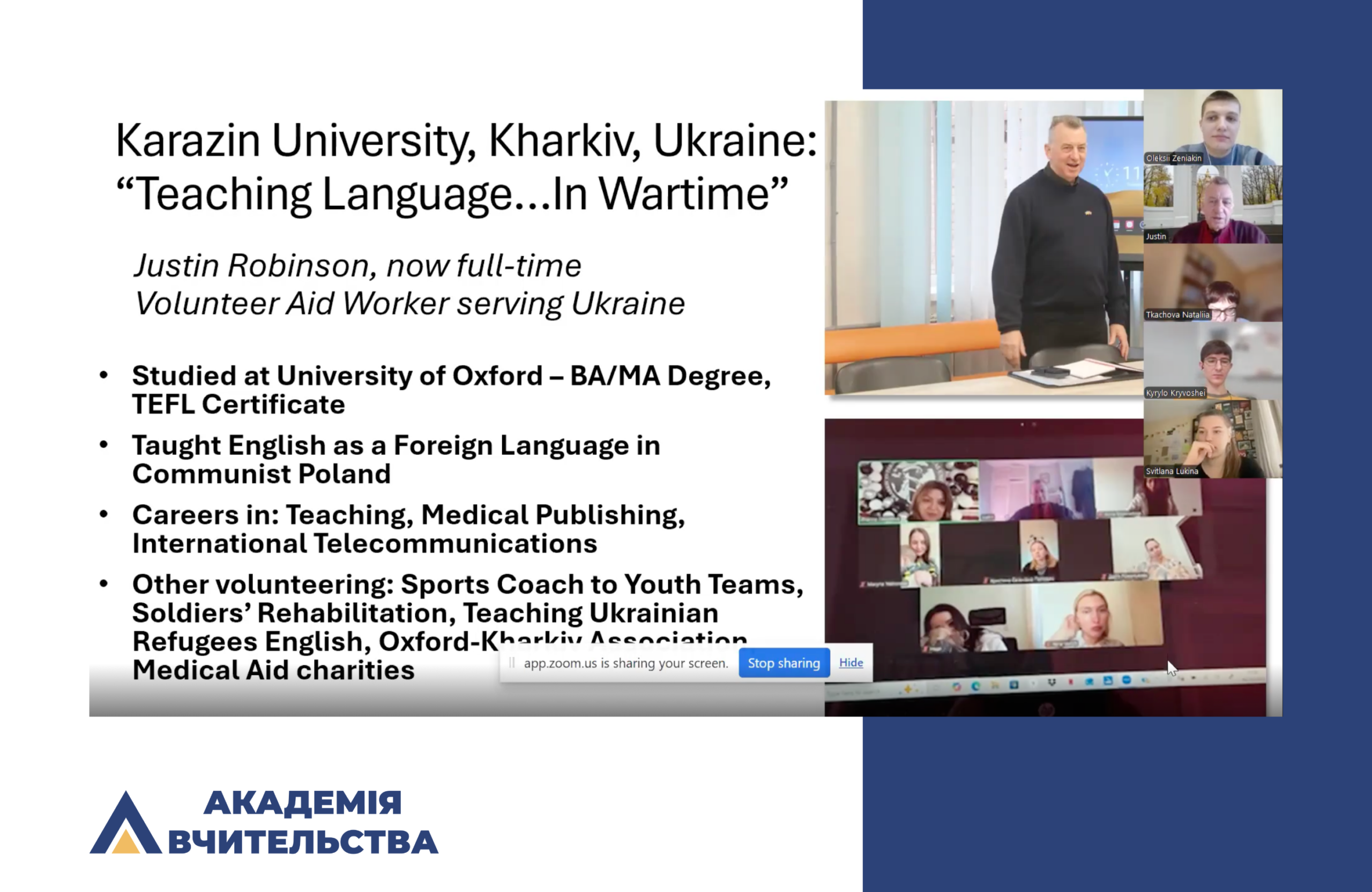 19 грудня 2025 року відбулася гостьова лекція члена Асоціації Oxford–Kharkiv, британського медичного та гуманітарного волонтера, керівника безкоштовних занять розмовної англійської мови в межах проєкту OXFORD-KHARKIV ONLINE FREE SPEAKING CLUB — пана Джастіна Робінсона.