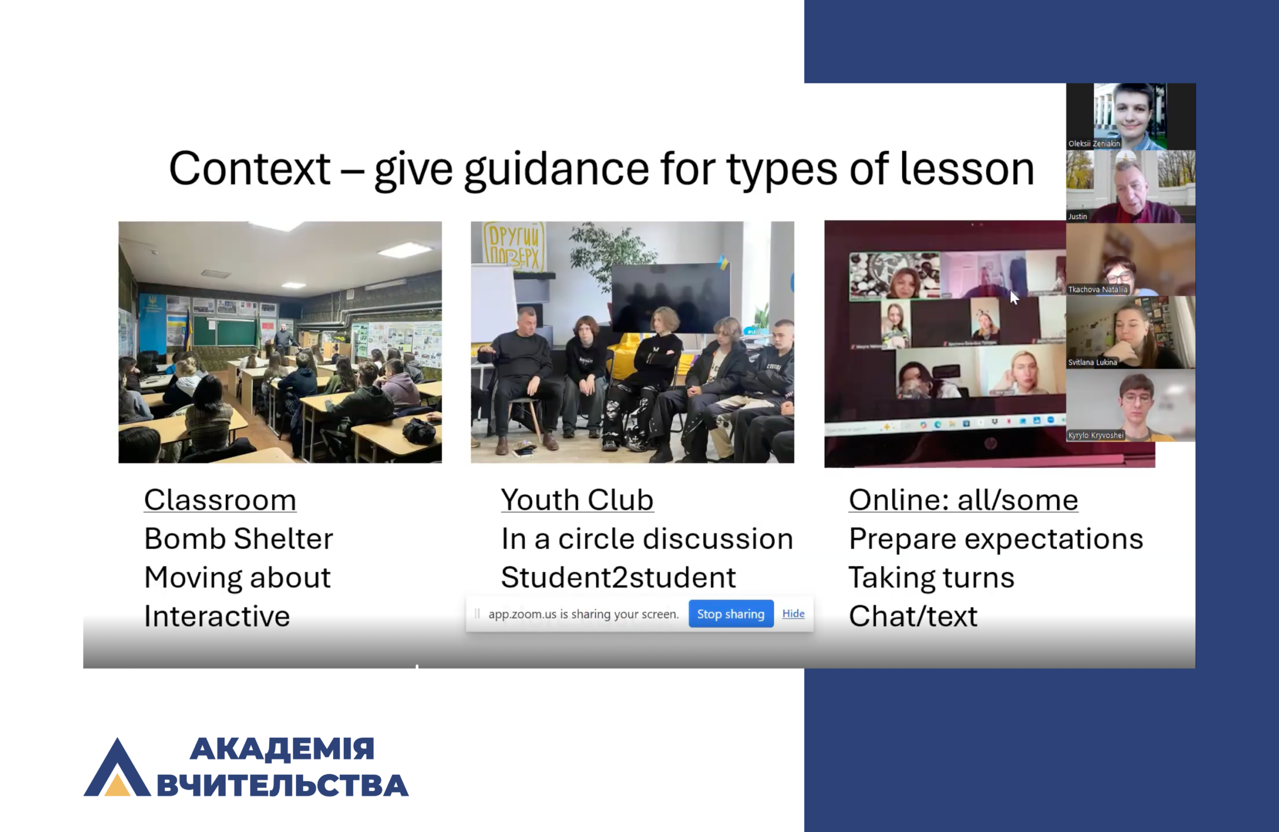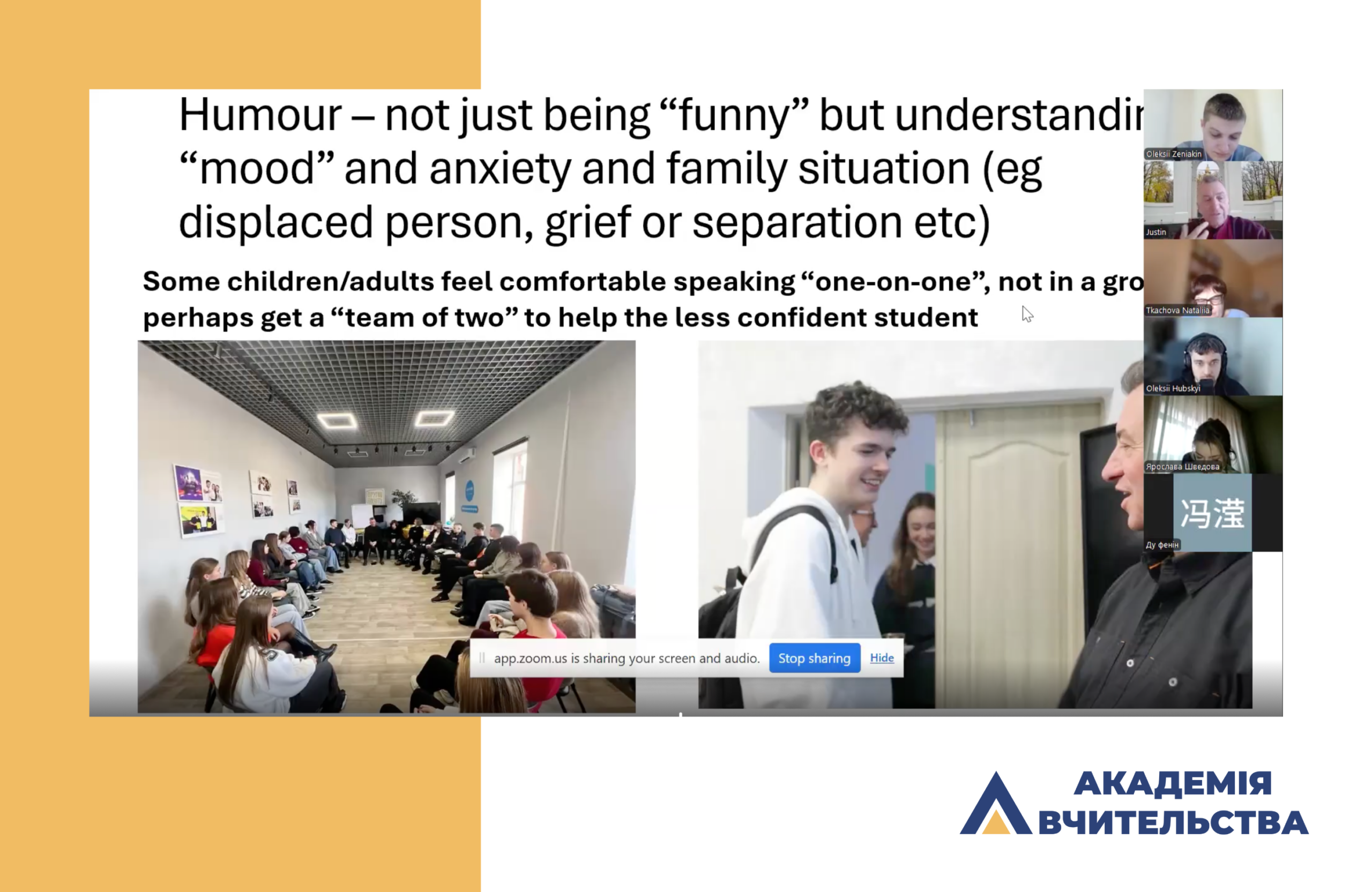 Лекція була присвячена особливостям розвитку іншомовної комунікативної компетентності здобувачів освіти в умовах онлайн-навчання. Доповідач зосередив увагу на формуванні навичок моно- та діалогічного мовлення, поділився практичними підходами до активізації усного мовлення студентів у цифровому середовищі, а також власним досвідом роботи зі слухачами міжнародних онлайн-проєктів.